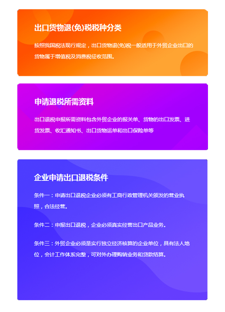 出口退稅是國家獎(jiǎng)勵(lì)出口的一種方式。分為退還進(jìn)口稅和退還已繳納的國內(nèi)稅款。企業(yè)申報(bào)出口貨物退(免)稅,可以降低外貿(mào)公司成本,增強(qiáng)外貿(mào)出口產(chǎn)品在國際市場(chǎng)上的競(jìng)爭(zhēng)力。丁當(dāng)財(cái)稅出口退稅代理,根據(jù)最新出口退稅規(guī)定,提供出口貨物退(免)稅服務(wù)。
